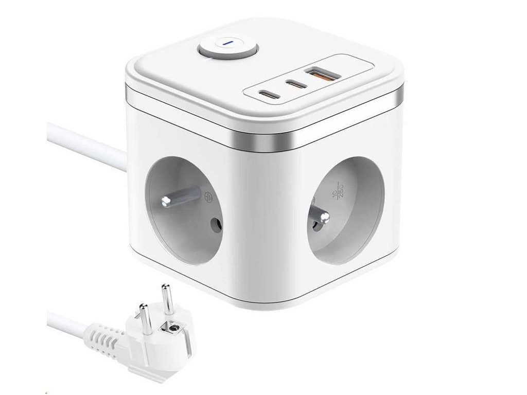 Viking síťový adaptér YC33, 3x 230 V, 1x USB-A, 2x USB-C, tlačítko ON/OFF, délka 1,4 m, bílá VYC33W