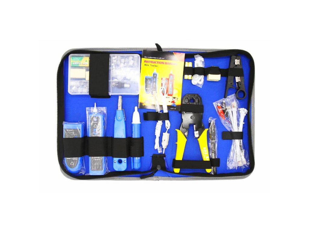 Obsah: - 1ks tester kabelů s hledací sondou - 1ks detektor napětí - 1ks krimpovací kleště 3 v 1: RJ45, RJ11, RJ12, konektory typ 8P8C, Cat5, Cat5e, Cat6, Cat3 4P4C, 6P6C - 1ks krone narážecí nástroj - 1ks ostraňovač izolace vodičů - 1ks krone spojka -RJ11 - 15ks 6P6C modulární konektor RJ11 - Krone modulová šňůra 110-RJ11 - 10 ks konektor Cat5e 8P8C - 10 ks konektor Cat6 JR45 8P8C - 1ks RJ45 prodlužovací rozdvojka se 2 porty - 1ks 6P prodlužovací adaptér - 1ks BNC-RJ45 adaptér - 20ks Stahovací páska na kabely - 1ks značkovací pero - 1ks úložný box na konektory - 1ks sluchátka - 1ks brašna na nářadí