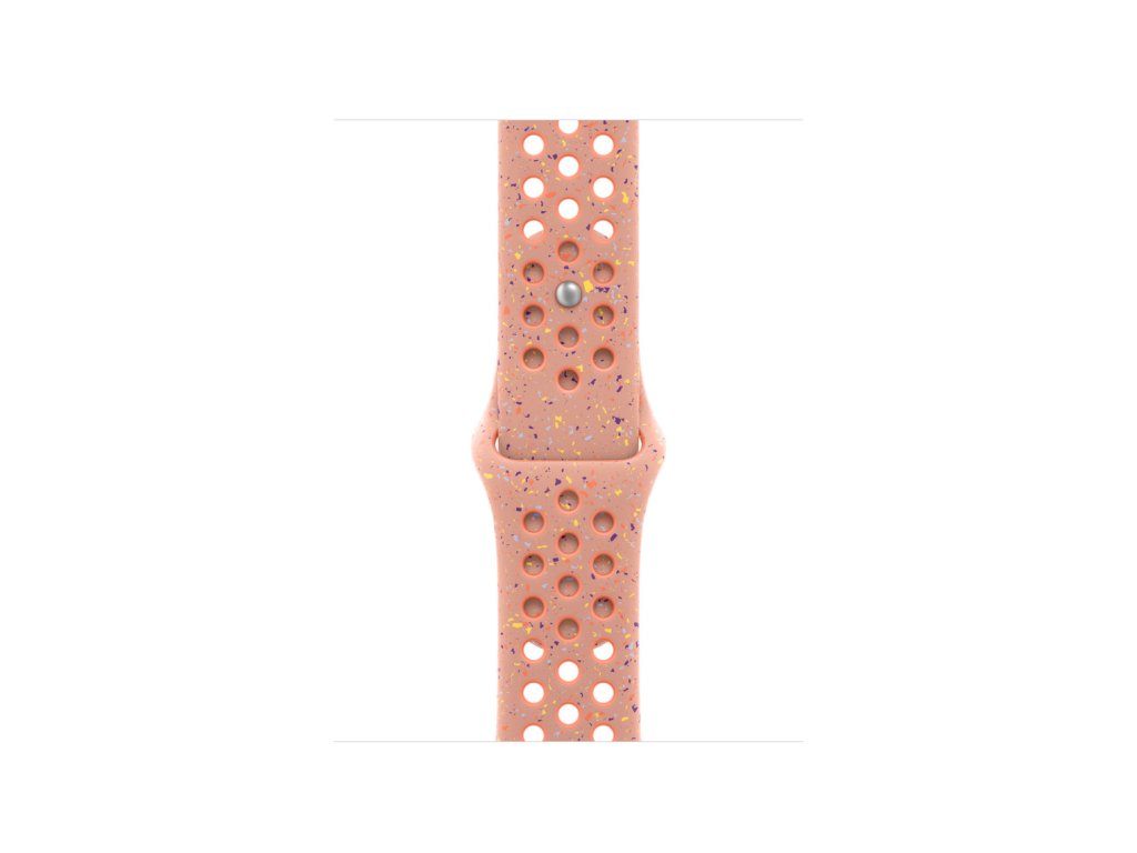42mm Alpenglow Pink sportovní řemínek Nike Tenhle sportovní řemínek Nike má vylisované otvory pro větší vzdušnost, je odolný, pevný a přitom překvapivě poddajný. Obsahuje barevné vločky, které tvoří náhodné vzory, takže každý řemínek je originál. Jeho hladký, hutný materiál se elegantně ovine kolem zápěstí a příjemně sedí. A zapíná se na hliníkový kolíček s matným povrchem, do kterého je pečlivě vygravírované logo Nike Run. *Materiál: Hliník, Fluoroelastomer Kompatibilita Modely Apple Watch *38 mm *40 mm *41 mm *42 mm M/L: Na zápěstí s obvodem 150–200 mm.