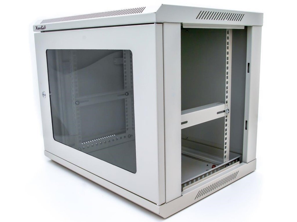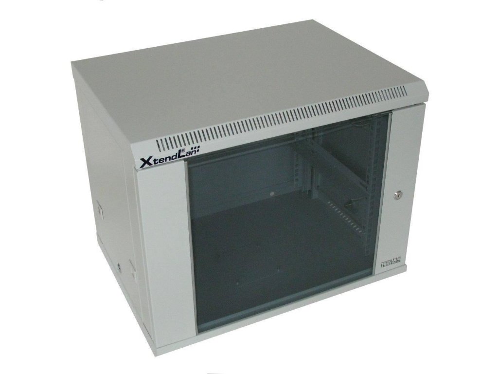 XtendLan 19" nástěnný rozvaděč 9U 600x450, nosnost 60 kg, skleněné kouřové dveře, svařovaný, šedý WS-9U-64B-GREY